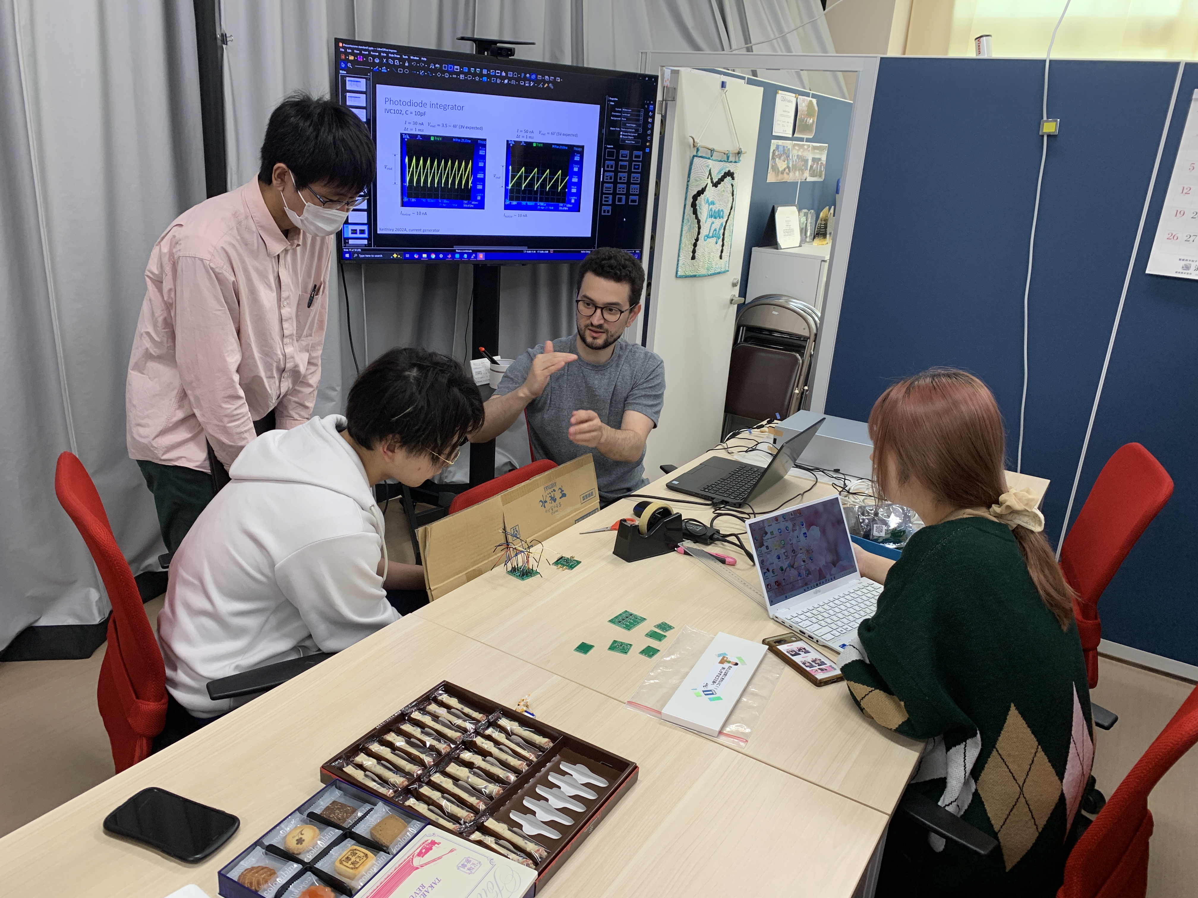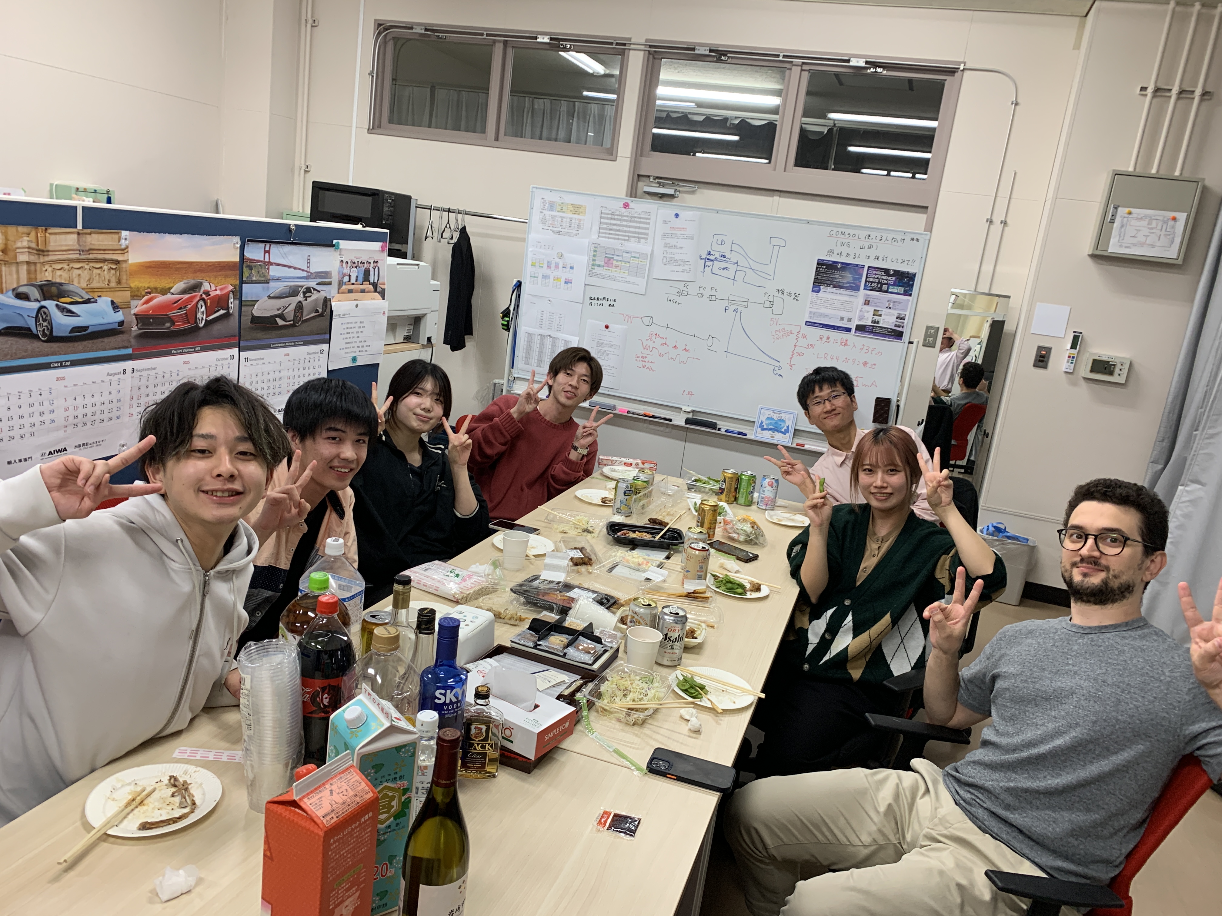 NTT物性基礎研のMarianiさんが来訪されました 共同研究先であるNTT物性科学基礎研究所のDr. Giacomo Marianiさんが、本研究室に来訪されました。実際にダイヤモンドNVセンタの光検出磁気共鳴(ODMR)測定を行い、 測定のコツやデータ解析方法などを丁寧に指導していただきました。学生たちはMarianiさんの英語での指導に必死に耳を傾け、多くのことを学べたようです。夜は研究室で親交を深めました。 Marianiさん、ありがとうございました!
